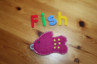 I made Counting Fish a while back but never got around to making a 'fishing pole' for them. No worries, Cranky to the rescue! We 'caught fish' and counted how many Cranky could hold up in the air (lots of focus on Four and Five because of the Ff sound). I know they are only 2 1/2, but I really like incorporating the spelling of the words we're using during activities too. I'm sure they aren't getting it yet, but it'll come eventually!